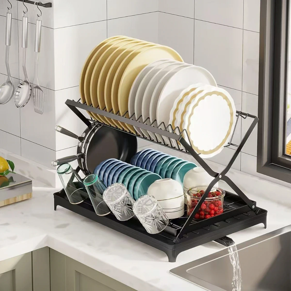 Da. Datorită designului vertical și pliabil, scurgătorul este ideal pentru bucătării mici, ajutând la optimizarea spațiului.