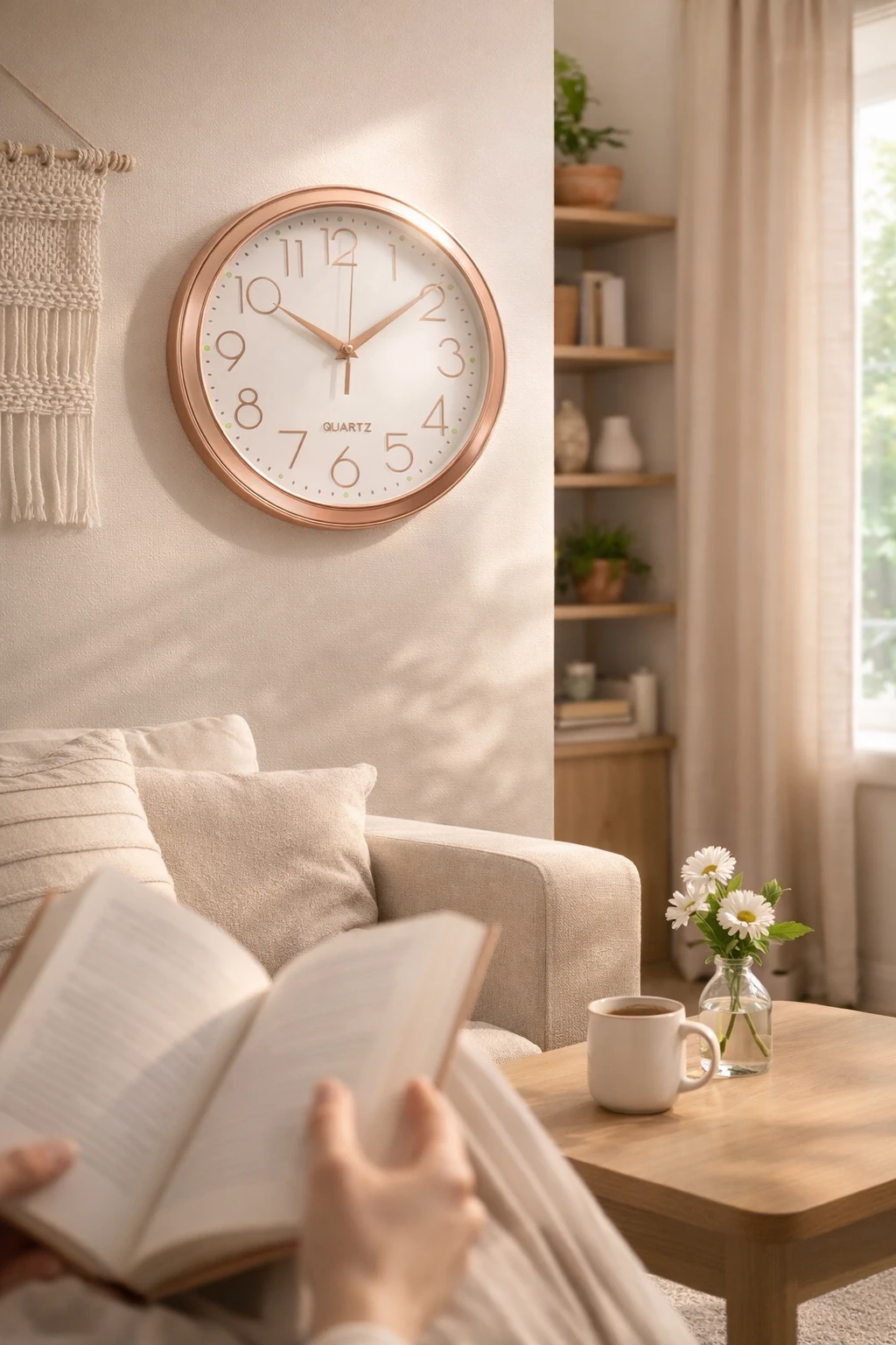 Ceas de perete silentios Quartz – eleganță clasică și liniște deplină în orice cameră Transformă fiecare încăpere într-un spațiu armonios cu acest ceas de perete silentios, rotund, cu mecanism Quartz precis. Designul său minimalist în Rose Gold aduce o notă de rafinament atemporal, perfectă pentru dormitor, living, birou sau bucătărie. ✔️Funcționare fără zgomot – mecanismul Quartz de înaltă precizie funcționează complet silentios, astfel încât să te bucuri de liniște totală, zi și noapte. ✔️Design elegant și versatil – combinația clasică Rose-Gold se potrivește oricărui stil de decor, de la modern la tradițional. ✔️Citire ușoară – cadranul clar, cu cifre vizibile și capac transparent, asigură o vizibilitate perfectă din orice unghi. ✔️Montare simplă – se agață rapid pe orice perete, fără unelte speciale. ✔️Consum redus de energie – funcționează cu o singură baterie AA (neinclusă), ideal pentru utilizare îndelungată. Un ceas de perete elegant și practic, creat pentru cei care apreciază liniștea, simplitatea și stilul rafinat. Potrivit pentru dormitor, living, bucătărie, birou sau sala de mese – un detaliu decorativ care adaugă farmec și ordine fiecărui moment al zilei.