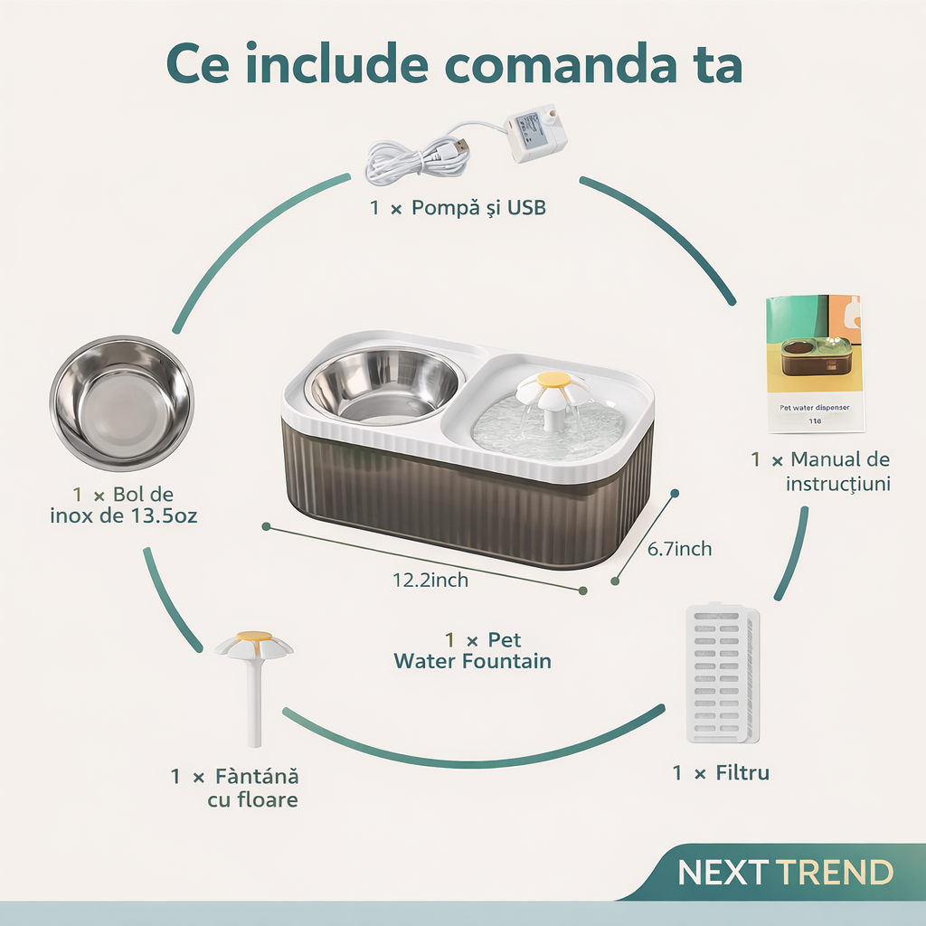 Oferă apă curată, proaspătă, filtrată, funcționare silențioasă, capacitate mare, design atractiv pentru animale și întreținere simplă.
